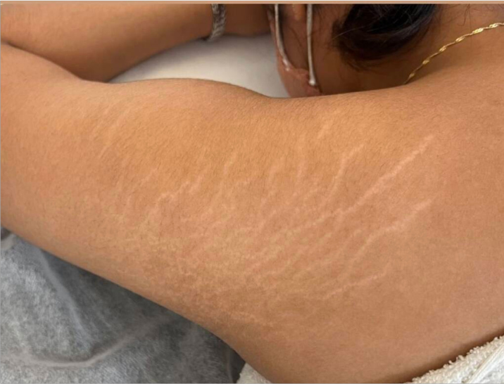 A clearer complexion also returned to her skin, including a severe reduction in the depth of stretch marks and much smoother, softer scars after only 6 skin preparation sessions and 3 ‘Nue Clear’ inkless sessions.